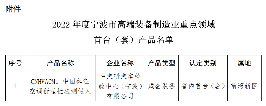 近日,寧波市經(jīng)濟(jì)和信息化局、寧波市財(cái)政局聯(lián)合公布了2022年度寧波市高端裝備制造業(yè)重點(diǎn)領(lǐng)域首臺(tái)(套)產(chǎn)品名單。中汽研汽車檢驗(yàn)中心(寧波)有限公司研制的“中國(guó)體征空調(diào)舒適性檢測(cè)假人”,綜合技術(shù)達(dá)到國(guó)內(nèi)領(lǐng)先水平,被認(rèn)定為浙江省首臺(tái)(套)產(chǎn)品。