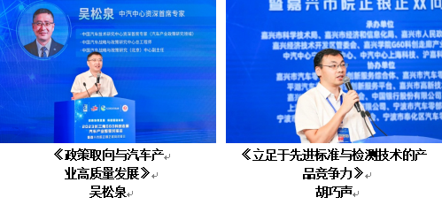 韓國兩院院士、嘉興學院納米技術研究院院長洪淳亨,烏克蘭外籍院士、新加坡優(yōu)泰科技有公司董事長夏慶華,中汽中心資深首席專家、中汽政研總工程吳松泉,合眾新能源創(chuàng)始人、副總裁林偉義,中汽中心寧波檢驗中心技術總監(jiān)胡巧聲為與會人員帶來汽車產業(yè)相關主題報告。