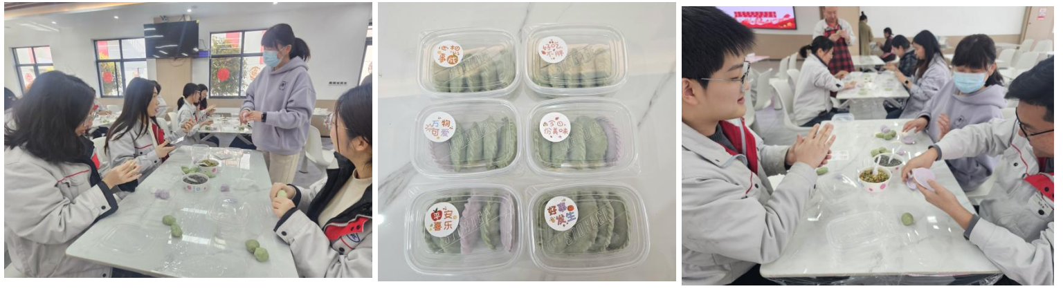 制作過程中,老師向大家講解關于艾餃的家庭故事和清明習俗,大家了解了清明吃艾餃的歷史及其所蘊含的深厚文化底蘊和民俗意義。在面點師傅的指導下,大家將清明時節(jié)碧綠的艾草汁融入雪白的糯米粉,手中的面團在掌心里輕攏慢揉。和面、揉面、包餡,分工合作,制成了一個個翠綠飽滿、餡料豐足的艾餃。